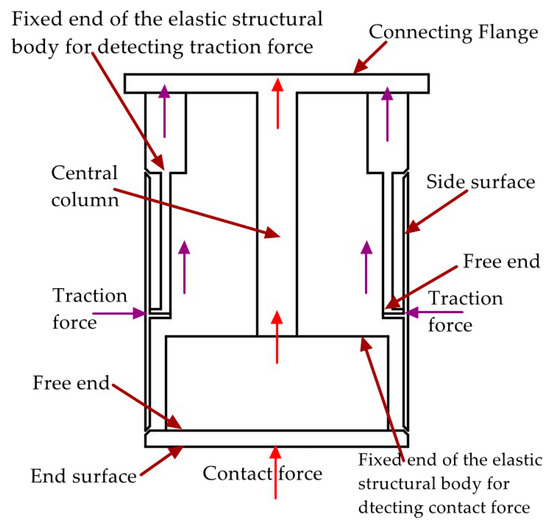 Each perceptual unit in the tandem force sensor is composed of an elastic structural body, strain type sensors pasted on the ESB, etc., and the two ESBs in it are shown in Figure 1b. The two ESBs in the tandem force sensor are connected in series, and the serial connection mode can be explained by Figure 2. The free end of the ESB for detecting traction force is connected to the side surface, and the end surface is fixed to the free end of the ESB for detecting contact force. The fixed end of the former is directly connected to the connecting flange, while the fixed end of the latter is indirectly fixed to the connecting flange through the central column. In addition, all the connections are made by screw fastening. In application, the traction force applied to the side surface will transmitted to the ESB for detecting traction force and ultimately to the connecting flange, as shown in Figure 2. The contact force exerted on the end surface will flow to the ESB for detecting contact force and to the connecting flange through central column. By adopting the connection mode shows in Figure 2, the traction and contact forces can be detected by the corresponding ESBs, and do not interfere with each other. Finally, the tandem force sensor can achieve the perception of traction and contact forces in decoupled manner.