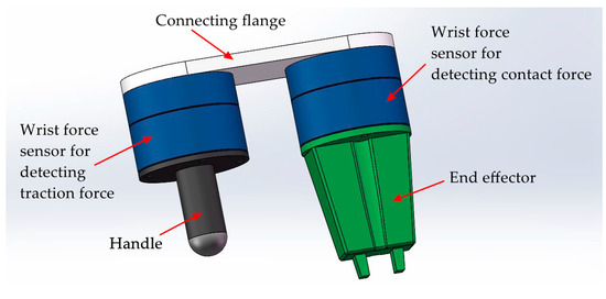 Two wrist force sensors installed in parallel for detecting the traction and contact forces.