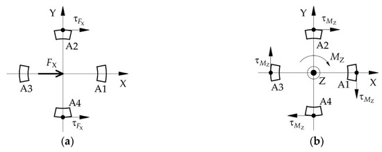 Under the MZ, the direction of shear stress of the points in the outer surface of A1 and A2 is opposite to that of A3 and A4 respectively, as shown in Figure 7b. However, under the FX, the direction of shear stress of the points in A2 and A4 is the same (Figure 7a). Similarly, under the FY, the direction of shear stress of the points in A1 and A3 is the same. Therefore, the measurement of FX or FY that using the shear stress of the outside surface of A2 and A4 or A1 and A3 respectively will not be affected by MZ.