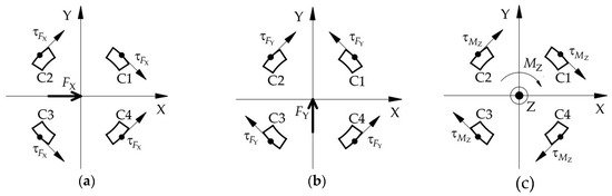 For layer B, the shear stress in A1, A2, A3, and A4 transmits to B12, B34, B56, and B78 that connects with layer A. Then, B1−B8 under the normal stress, which does not affect the measurement of MX, MY and FZ. The normal stress in B1−B8 causes stress in B23, B45, B67, and B81, which induces the shear stress in C1, C2, C3, and C4. The values of the shear stress in the outside surface of C1, C2, C3, and C4 are the same as that of layer A, which can be figured out by using Equation (7). Similarly, the direction of the shear stress of the points in the outside surface of C1 is opposite to that of C3, the direction of the shear stress of the points in the outside surface of C2 is opposite to that of C4 (Figure 8c). Besides, FX and FY also affect the shear stress of the points in the outside surface of C1, C2, C3, and C4. However, according to Figure 8a,b, under FX and FY, the direction of the shear stress of the points in the outside surface of C1 is the same as that of C3 and the shear stress of the points in the outside surface of C2 is the same as that of C4. Hence, the shear stress in the outside surface of C1, C2, C3, and C4 can be used to detect MZ without being affected by FX and FY.