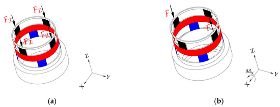 Force diagram of the cylindrical traction force sensor: (a) under the force FZ; (b) under the torque MX.