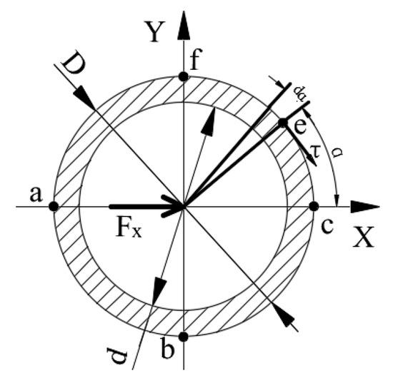According to Equation (1), the shear stresses of point a and point c are zero, and the shear stresses of point b and point f are the largest. Then, the distribution of shear stress values of points in the outer surface of the circular ring is shown in Figure 13.