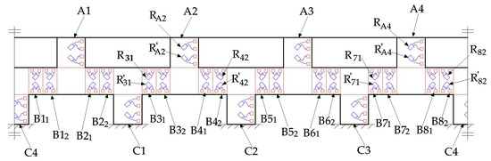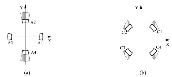 When the moment MX acts on the cylinder-shaped ESB, the force/moment applied on A1, A2, A3, and A4 can be simplified as shown in Figure 9b, which leads to the occurrence of normal stress in the A1, A2, A3, and A4. In addition, under the MX, C1, C2, C3, and C4 will also produce normal stress, but no shear stress. When the MX is positive, A2 bears the largest tension and A4 understands the largest pressure. However, the normal stress in A1 and A3 is close to zero, because the central axis of twist goes through A1 and A3. For the layer B, the tension applied on A2 will transmit to B34, and the tension in B34 will cause shear stress in the outside surface of B3 and B4. Similarly, the outside surface of B7 and B8 will also produce shear stress. Because the normal stress in A1 and A3 is approximately zero, the tensions/pressures applied on B3 and B4 or B7 and B8 induced by moment MX approximate to . Then, the largest shear stress value of the points in the outside face of B3, B4, B7 and B8 can be figured out.