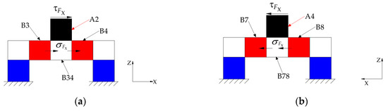 Unlike layer A and layer C, under the FX, the layer B bears no shear stress. For layer B, the shear stress in A2 and A4 transmits to B34 and B78 that connects with layer A, which induces the occurrence of the normal stress in layer B, as shown in Figure 15. This paper utilizes the shear stress in the ESB to measure the traction force. Therefore, the normal stress in layer B will not affect the measurement of MX, MY and FZ.