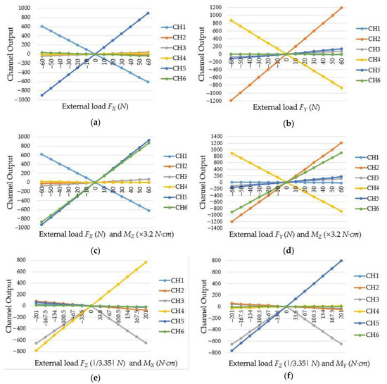 The output voltage changes of electric bridges: (a) under the force FX; (b) under the force FY; (c) under the force FX and moment MZ; (d) under the force FY and moment MZ; (e) under the force FZ and moment MX; (f) under the force FZ and moment MY.