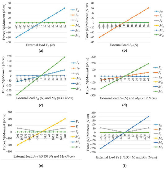 Force/Torque obtained by the cylindrical traction force sensor: (a) the force FX acts on the sensor; (b) the force FY acts on the sensor; (c) under the force FX and torque MZ; (d) under the force FY and torque MZ; (e) under the force FZ and torque MX; (f) under the force FZ and torque MY.