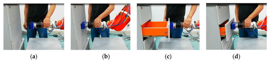 With the developed tandem force sensor, the drawer switch experiment can complete with human–robot interaction without damaging the drawer, and the robot can obtain several effective demonstrations. In the human–robot interaction to finish the drawer switch experiment, the tandem force sensor is mounted at the end of the robot and vacuum chuck, which allows the robot to control the opening and closing of drawers, is attached to the contact force sensor. In human–robot interaction, the teacher chooses a drawer in the locker and selects the adsorption area of the drawer. People guide the robot move from the initial point to the selected drawer, and control the suction cup to hold the drawer. Then, the human guides the robot to open the drawer to the maximum and finally, the human guides the robot to close the drawer, as shown in Figure 24. In this process, the tandem force sensor detects the traction force and the contact force between vacuum chuck and drawer, which allows the robot to act according to human intentions and its contact state with the object being operated on, not just human intentions. During the experiment, the data sampled by the tandem force sensor and the action taken by the teacher are saved as state-action pairs. Then, the robot can learn the policy of drawer switch task and perform drawer opening and closing by itself (Figure 25), which confirms the feasibility and effectiveness of the tandem force sensor.