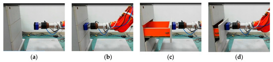 Human-robot cooperate to finish drawer switch experiment: (a) approach to the target; (b) grab the target; (c) open switch (d) close switch.
