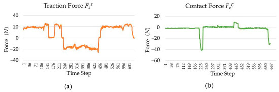 The change curve of the traction and contact forces in the drawer switch experiment: (a) Traction force ; (b) contact force .