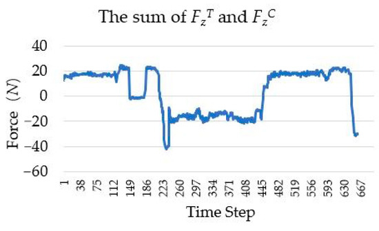 In the human–robot interaction, to complete the drawer switch experiment, the change curves of and (superscript T and C represent the traction force and contact force sensors, respectively) are shown in Figure 26. Owing to the inaccuracy of manual operation, the numerical fluctuation of the traction force is high, while the numerical fluctuation of the contact force is lower than . In order to simulate the force curve in the kinesthetic teaching of drawer switch experiment based on single wrist force sensor, the resultant force of the traction force and the contact force has been calculated, as shown in Figure 27. By comparing Figure 26b and Figure 27, it can be seen that the resultant force cannot accurately represent the contact state between the robot and the drawer. If the task policy is learned based on the resultant force, it cannot make the right decision. For example, when the drawer switch task policy is learned based on the data shown in Figure 27, the learned policy only outputs effective action instructions when the absolute value of contact force is about 20 N, instead of 0 N. Therefore, the net contact force obtained by the tandem force sensor is necessary for learning effective contact task policy.