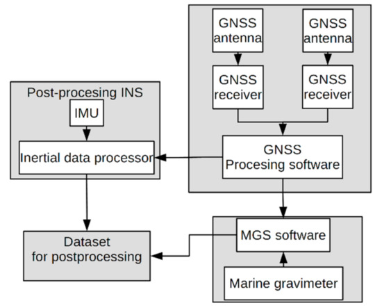 The scheme showing the flow of data during the measurement campaign. Abbreviations used: Global Navigation Satellite Systems (GNSS), Inertial Navigation System (INS), Inertial Measurement Unit (IMU), Marine Gravity System (MGS).