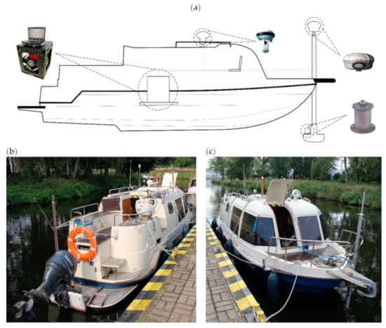 The position of the research vessel was measured using two GNSS antennas and receivers, a Trimble R8 and a Leica GS 15. The SMC IMU-10 was used as an inertial sensor. The data flow in the whole measurement setup is shown in Figure 1. The physical location of each sensor is indicated in Figure 2a.