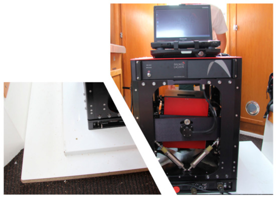 For the gravimetric sensor installation, thick chipboard plates were used. The installation project used two layers of plates. The first one was fitted to the deck of the ship, so it would not slide along it. The second layer was the base to which the frame of the MGS-6 was screwed. The thickness of the plates, which was 38 mm, allowed us to mill holes for mounting screw heads. As a result, both plates adhered to each other over a large area. The other benefit of this setup is that the sensor frame could be placed in the best location before the top plate was screwed with wood screws to the bottom one. This configuration is rigid and allowed us to precisely set the points of offset measurements using geodetic techniques. The whole structure provided a solid mount for the gravimeter frame on the ship despite the lack of pre-designed mounting places on the deck. Figure 3 shows the relative location of the gravimeter frame on the mounting plates.