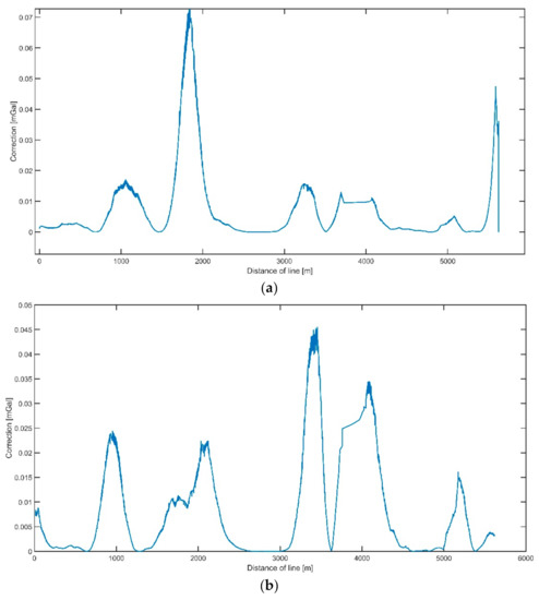 Impact of the curvature of the measurement profile on the recorded gravimetric signal. The spatial distribution of the correction is shown on the maps for the first line (a) and for the second line (b); a logarithmic scale is used.