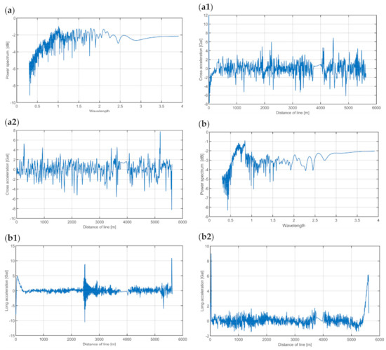 Signals from dilatometers installed in MGS-6. (a) Spectral power density for dilatometer signals for cross direction; (a1) values of cross accelerations of the first profile; (a2) values of cross accelerations of the second profile; (b) spectral power density for longitudinal direction; (b1) values of longitudinal accelerations for the first profile; (b2) values of longitudinal accelerations for the second profile.