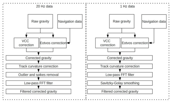 The higher sampling frequency allowed us to utilize a different type of data processing (Figure 7). The raw gravity data were corrected by the application of both the VCC correction and the Eotvos correction calculated from the navigation data. In the second stage, the resulting corrected gravity was carefully examined in order to remove all outliers from the data, after which the data were filled using the autoregressive model (ARMA). The resulting data were filtered using the same one-pass low-pass FFT that was used for processing the data from the first campaign. The cut-off wavelength was set to 600 s, and the stopband, to 400 s. No additional filtration was used.