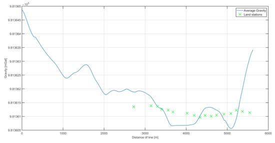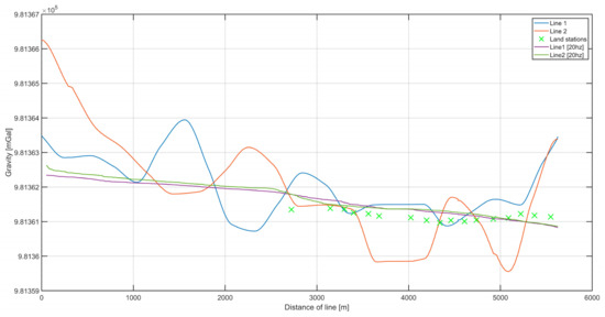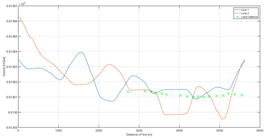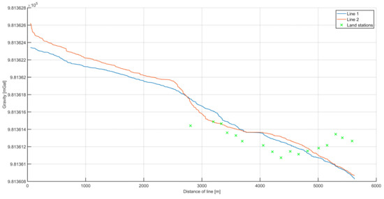 Figure 12 presents data from the second campaign, with the usage of a higher (20 Hz) registration frequency. Once again, gravity was measured on the river during two passages, called lines 1 and 2. These lines overlapped each other, so the differences in values between them could be used as the measure of misclosure (internal accuracy). The green crosses in Figure 12 indicate the points where land gravity data were available. The height difference caused by the pier height was reduced using free-air reduction.