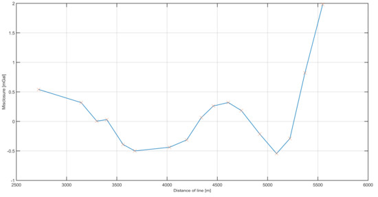The estimated internal error of the measurement data was 1.13 mGal. The varying differences between the measurement data on the two lines are plotted in Figure 9. The next step was to calculate the external accuracy by comparison with measurements conducted on the riverbank.