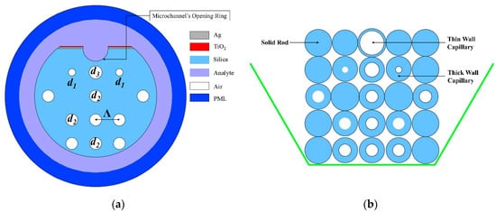 The cross-section of the PCF-SPR sensor proposed in this work is demonstrated in Figure 1a. This particular sensor had a square lattice setting possessing a couple of tiers of air hole ring. The coupling between the core guided mode and the SPP mode was enhanced by making use of the scaling down technique towards the two air holes (d1) from the first ring. From the middle of the 1st ring, opposite two air holes were removed to create a dual-core configuration. This particular sensor’s probable approach of fabrication is shown in Figure 1b. In order to fabricate the fiber, the stack and drawn technique can be used where all of the solid rods as well as capillaries are pulled at a certain rate just after stacking them with each other [3,19,20]. All the tiny, big, and no air holes can be constructed using thin and thick capillaries, respectively [20]. Immediately after finishing the fabrication, the polishing process can be utilized to style the D-shaped design as well as to produce microchannel [19,21]. In this case, the chemical deposition method was applied to coat TiO2 and plasmonic material on the glassy surface [3,16,22].