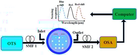 The performances of the proposed sensor were analyzed numerically. The experimental setup for the proposed sensor is illustrated in Figure 2, where the setup is incorporated with the optical spectrum analyzer (OSA), polarization controller, and optical tunable source (OTS); these components were connected in series with a Single-Mode Fiber (SMF). The D-shaped structure was used in the proposed sensor to place the sensing channel or analyte (for the target material’s RI to be sensed) at the external side. A pump was used to control the flow of analyte through the inlet–outlet channel. Redshifting (shifting towards higher wavelengths) or blueshifting (shifting towards lower wavelengths) was observed for the proposed sensor when the communal interaction between legends and analyte establishes and the shiftings were monitored by OSA.