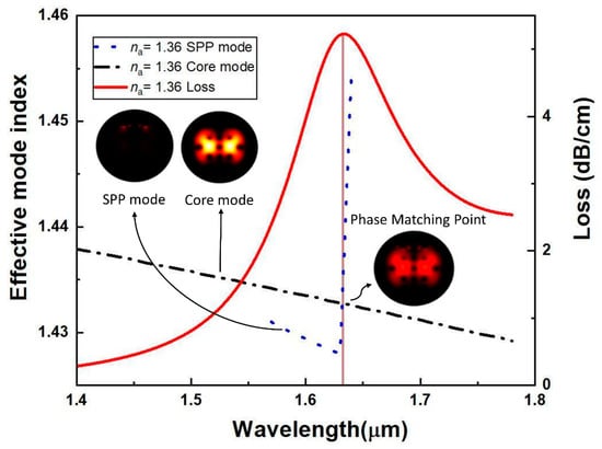 For the analyte with an RI of 1.36, the field distribution of the fundamental mode and SPP mode is shown in Figure 3. In this case, the SPP mode shows up at the sensing medium and microchannel coated with plasmonic-material (Au), while the whole optical field gets trapped in the core at the fundamental mode. Figure 3 illustrates the optical field distribution at the phase-matching condition. At the resonance condition, it is observed that a strong coupling was established between the core mode and plasmonic mode, ensuring that the maximum amount of energy was delivered from the core to the SPP mode. Loss spectra and the relation of dispersion of the core mode and SPP mode are presented in Figure 3. The intersection of refractive indexes of core mode and the 2nd-order plasmonic mode was observed to have an operating wavelength of 1.63 µm, whereas the analyte had an RI of 1.36. A noticeable evanescent field was produced due to the maximum number of free electrons from the y-polarized transverse electric (TE) mode TEy rather than from the x-polarized TEx mode [16]. The phase-matching condition was met at the resonance point, which led to the transition of all the power from core mode to SPP mode. As a result, a peak loss appeared at the point where refractive indexes of the two modes intersect each other.