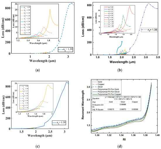 Figure 4a–c illustrates the loss spectra of the resonant wavelength where the value of analyte RI ranges from 1.29 to 1.39 in the case of plasmonic material Gold, Silver, and Copper. For the proposed sensor, redshifting with the confinement loss increasing was seen each time for all the plasmonic substances due to the incomplete coupling property explained in [22]. At RI = 1.39, when the wave vector of the transmitted light matches the surface plasmonic wave vector, the highest light penetration to the metal occurs for each plasmonic material, which creates a significantly strong coupling between the core mode and SPP mode. As a result, the highest confinement loss was observed as well as significant redshifting of peak loss wavelength for the proposed sensor at RI = 1.39. The polynomial fit R–square was 0.992, 0.995, and 0.993 for Gold, Silver and Copper, respectively (see Figure 4d), which indicates a well-fitting agreement.
