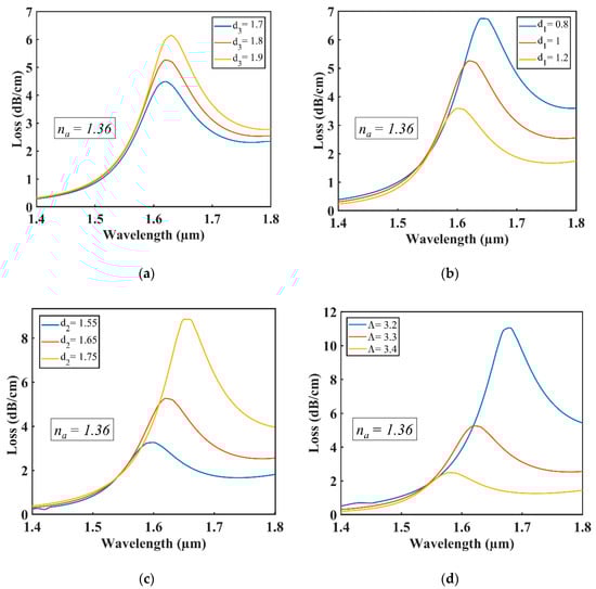 It is shown in Figure 5a that a minimal redshift with high confinement loss was observed as the established coupling strengthened between the core mode and the plasmonic mode when the air hole diameter of d3 increased from 1.7 to 1.9 µm. The redshifting occurs as the effective index of the fundamental mode and plasmonic mode changes with the changing of air hole diameter d3 and their phases matched at a higher wavelength point than the previous. Confinement loss increased due to the establishment of strong coupling between the core mode and plasmonic mode. Figure 5b shows that the confinement loss decreased with blueshift as the established coupling between the core mode and the plasmonic mode weakened when the air hole diameter of d1 increased from 0.8 to 1.2 µm. The blueshifting occurred as the effective index of the fundamental mode, and plasmonic mode changed with the changing of air hole diameter d1. Their phases matched at a lower wavelength point than the previous. Figure 5c shows a redshift followed by high confinement loss of resonant wavelength when the air hole d2 increased from 1.55 to 1.75 µm. Figure 5d also shows that changing the value of pitch from 3.2 to 3.4 µm resulted in a blueshift with low confinement loss. The optimized parameter values for d3, d1, d2, and pitch are 1.80, 1.00, 1.65, and 3.30 µm, respectively, as the highest sensitivities were achieved at these values for the proposed sensor.
