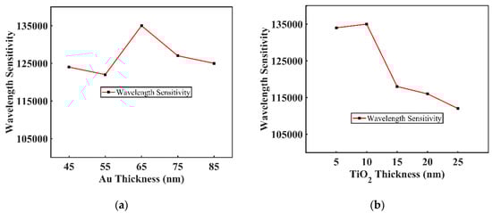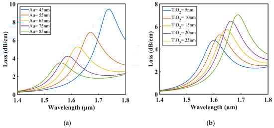 The impact of changing the thickness of TiO2 and Au on loss curves is shown in Figure 6a,b. Increasing the Gold layer thickness increased the damping loss, which resulted in poor penetration in the evanescent field, which results in low confinement loss [28,29]. Significant blueshift was seen with low confinement loss when changing the thickness of Gold from 45 to 85 nm. When the effective RI of the fundamental mode and plasmonic mode changes, the phase-matching condition also changes [30,31]. Figure 6b demonstrates redshifting with high confinement loss in the resonant wavelength when the thickness of gold remained constant at 65 nm, and the thickness of the TiO2 layer was increased from 5 to 25 nm. Moreover, a significant contribution was made by the TiO2 layer to create a strong coupling between the core mode and plasmonic mode. The optimal values for Au and TiO2 were 65 and 10 nm, respectively, as the proposed sensor showed maximum performance at these values.