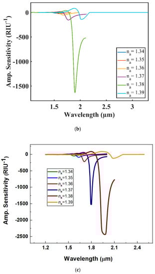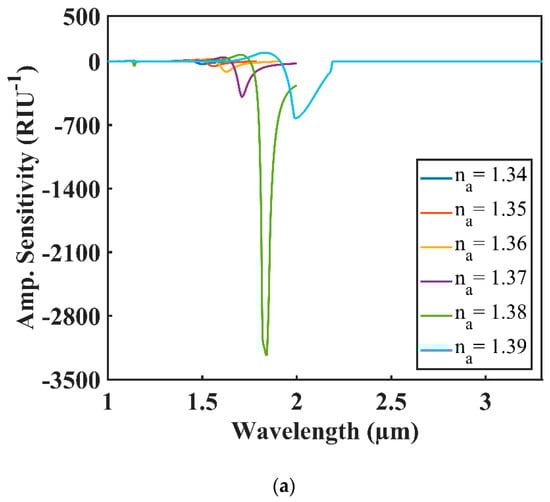 The maximum amplitude sensitivity (AS) of 3239, 2452 and 1637 RIU−1 for na = 1.38 was found for Au, Ag and Cu, respectively. The AS of the proposed sensor for changing analyte RI range from 1.34 to 1.39 for each plasmonic material is illustrated in Figure 7a–c.
