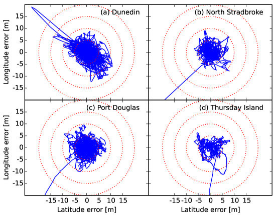 In Figure 2 the QQ-plot of the latitude data collected in Dunedin is depicted. In order to support the graphical findings, we have also calculated two more normality tests [23], one based on d’Agostino and Pearson’s work [24,25], and another one suggested by Lilliefors [26]. The latter is the most suitable for our use, as it does not assume the knowledge of mean and standard deviation of the normal distribution, but estimates these from the sample. The null hypothesis of both tests is that the data come from a normal distribution. Since both tests return p-values much smaller than 0.01, we can thus conclude at a 99% confidence level that latitude data do not support the assumption of normal distribution. Similar conclusions can be drawn for longitude and altitude data at all locations.
