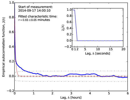 where is the cumulative distribution function of the standard normal probability distribution, is the required level of significance, denotes the sample standard deviation, and n is the number of measurements. This confidence interval at the level is plotted with dashed lines in Figure 3. The majority of falls outside this interval; therefore, our observations and the assumption of Gaussian white noise are inconsistent with each other. One may take into account that the empirical autocorrelation function estimated from a finite-length time series also carries error [37] and could derive a modified confidence interval. At significance level , this is given by the Box–Jenkins standard error [38,39,40]: