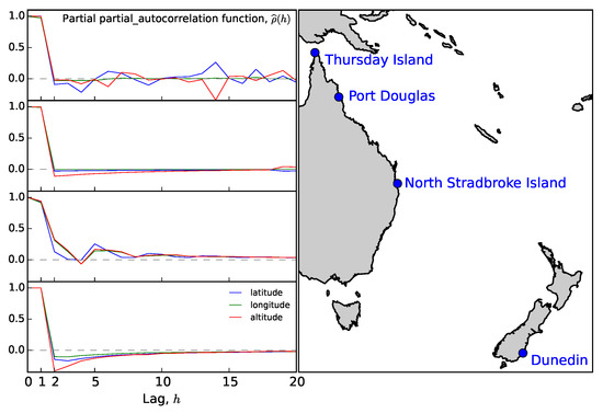 The partial autocorrelation function, , for longitude, latitude, and altitude at all geographic locations visited. The lag is measured in seconds.
