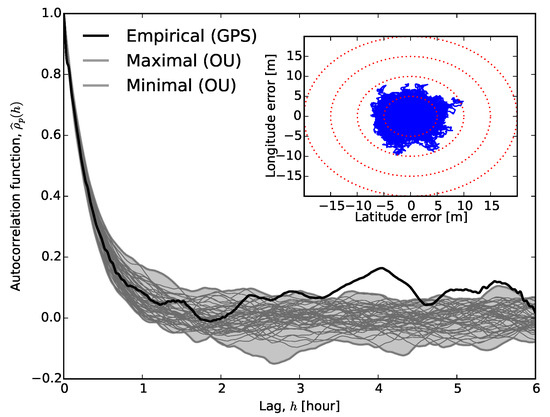 One may simplify (6) by eliminating with the transformation, but we keep explicit, as it is the ‘true’ position of the GPS device. The parameter sets the scale of the autocorrelation function , while determines the noise between measurements. The OU process is the continuous-time generalisation of an AR(1) process. It has several desirable properties: (a) It is mean-reverting for , (b) it has finite variance for all contrary to Brownian motion, (c) its analytic covariance permits a long autocorrelation time, (d) the autocorrelation function is insensitive to the sampling rate, and (e) it approaches Gaussian white noise as . More precisely, the OU process is the only non-trivial, mean-reverting, Gauss–Markov process, i.e., whose transitions are memory-less, and it thus allows predictions of the future state based on the current state [50]. This does not prohibit more sophisticated models for GPS time series, but these models will lack at least one of the properties listed above.