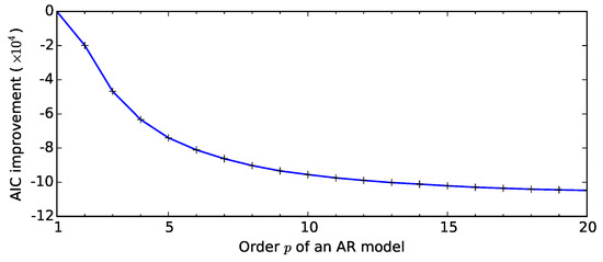 The most common model selection criteria use the likelihood function, L, and introduce some penalty proportional to the model complexity. Akaike’s Information Criterion (AIC) is defined as , where k is the number of fit parameters in the model [56,57]. The best model has the smallest AIC value—it encodes the most information using the least number of fitted parameters. The AIC has a definite minimum value with respect to k, and the appropriate order of the model is determined by the value of k at this minimum. The AIC is biased for small samples, and a bias-corrected version (AICc) is gaining popularity [43]. Here, we analyse time series with and , so we can ignore this correction. Other criteria have been developed, e.g., Bayesian Information Criterion (BIC), which more severely penalises the introduction of extra model parameters by replacing the term with .