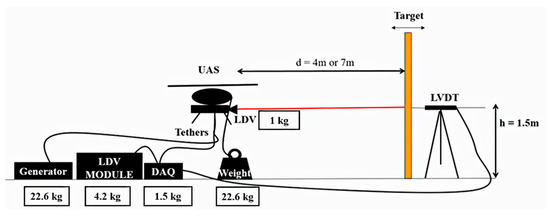 In this section, the experimental layout for displacement measurement using an LDV mounted on UAS, and its implementation for field testing are explained in detail. Figure 5 shows the experimental layout for field testing using the LDV mounted onto the UAS. The measurements obtained by the vibrometer are compared to the actual displacement of the target recorded by LVDT. The connection between the vibrometer and its data acquisition unit is a fixed optical fiber cable. Thus, to protect the vibrometer and to prevent injuries and damage in the event of sudden and unexpected drone movement, the UAS is tethered to the ground using a heavyweight.