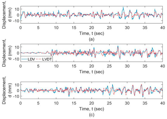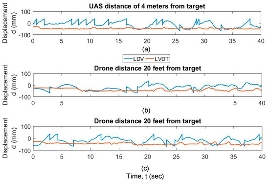 Filtered signal from LDV mounted on the UAS versus filtered LVDT signal for (a) LDV at a distance of 4 m from the target, (b) LDV at a distance of 7 m from the target (trial 1), and (c) LDV at a distance of 7 m from the target (trial 2).