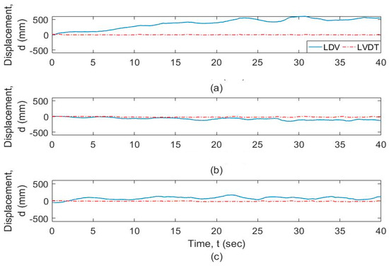 Raw LDV and LVDT output data for (a) LDV distance of 4 m from the target; (b) LDV distance of 7 m from the target (trial 1); and (c) LDV distance of 7 m from the target (trial 2).