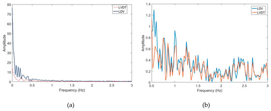 Comparison of signals of the LDV mounted on the UAS and LVDT when sensing at 7 m from the target: (a) total comparison (0–3 Hz) and (b) zoomed comparison (0.5–3 Hz).
