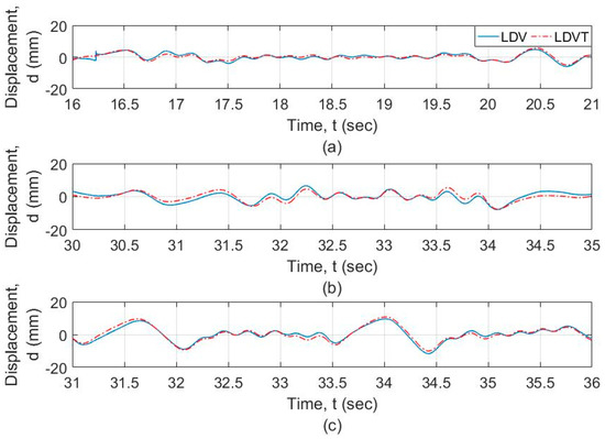 The frequency-domain analysis of the signals from the vibrometer and the LVDT is shown in Figure 9 at different resolution levels and frequency ranges. Figure 9a shows that the motion of the UAS adds spurious components to the response, especially at the lower frequencies. Figure 9b shows that the signals from the vibrometer as well as the LVDT show a similar profile at frequencies greater than 0.5 Hz. Both signals from LDV and LVDT are filtered using a high-pass filter with a cut-off frequency of 0.5 Hz as explained in Section 2, which is acceptable for timber railroad bridges. The plot of these signals is shown in Figure 10. It is observed that the two signals match for the general dynamic displacement in the time domain. Figure 11 shows the filtered signals enlarged to the selected regions where the measurement was within range and when the LDV measurement was in target. For the selected regions with stable UAS and continuous LDV monitoring, the LDV and LVDT dynamic signals match both in amplitude and phase. The next section calculates and quantifies the errors.