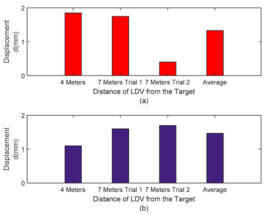 Of the three successful trials, one was captured from a distance of 4 m from the target, and two from a distance of 7 m from the target. Figure 7 shows the raw data captured by the vibrometer data acquisition system for these three trials. During the three experiments, the LDV exceeds the range during the hovering. The LDV data exceeds the range due to the UAS hovering in excessive transverse or lateral directions with respect to the target, and the measurement “returns-to-zero” as explained in Section 2. The range can be exceeded either if the UAS moves away from the target beyond the range in the transverse direction LDV, or by the UAS rotating or translating laterally, which will cause the LDV reading to fall outside the target. During the various field validation tests, the following conclusions can be made. (1) In general, the pilot skills were not sufficient to control the inherent hovering during testing, so LDV readings in general fell out of range at certain periods of time during the monitoring; (2) out of range events were automatically corrected with a “return-to-zero” feature built in the vibrometer controller, with close to zero disruption of the signal; and (3) as a result, the displacement accuracy can only be trusted in the regions in between “out of range” events. Figure 8 shows the data captured by the vibrometer data acquisition system for these three trials corrected with “return-to-zero” feature. Figure 8 shows that the output is drifting due to the motion of the UAS at low frequency.