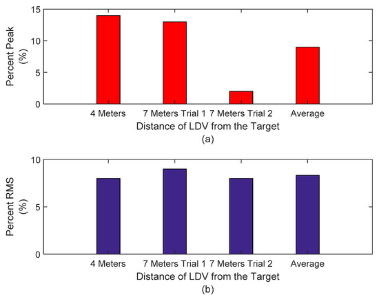 (a) Peak signal difference comparison between filtered LVDT and LDV signals in percentage and (b) RMS signal difference comparison between filtered LVDT and LDV signals in percentage.