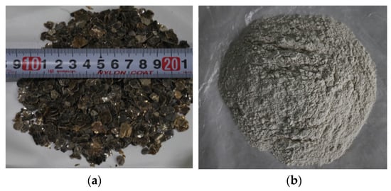 Vermiculite, a multilayer silicate mineral, consists of hydrated silicates of aluminum, magnesium, iron, calcium and potassium. When the vermiculite is heated rapidly over 800 °C, its volume increases up to 20–30 times. Note that the expansion depends on vermiculite composition []. Expanded vermiculite is used for building materials, insulation, and environmental protection because it has lightweight, non-toxic, chemical inertness, and flame-retardant properties. Figure 1a shows a vermiculite flake. The natural mineral contains three types of water: absorbed water, interlayer water, and crystal water. When the vermiculite is rapidly heated, the moisture in its layers evaporates into water vapour, thereby generating a burst of pressure within the vermiculite. As the pressure is released, the vermiculite peels and then expands. The proposed vibration-free excavation method is based on the expansion pressure of the vermiculites to crack the rock without a chemical explosion. To increase the total expansion pressure, all the vermiculite flakes in a hole should be heated almost simultaneously. It is important that heat energy is evenly distributed among vermiculite flakes from the surface of a heater rod, which acts as a heat source, along the central axis of the hole. In this study, MgO is used to pass heat to all vermiculite flakes thoroughly. MgO, a compound of magnesium and oxygen, absorbs water and carbon dioxide from the air. MgO is chosen owing to its high insulation property (1 × 1017 Ω·cm) and high thermal conductivity (≥ 40 W/mK). The ratio of the amount of the vermiculite and MgO was experimentally determined [,].