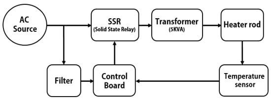 In this study, a modified heating system was developed to overcome the limitation of the inability of increasing the temperature rapidly in early research []. Figure 2 shows the block diagram of the newly developed heating system. The solid state relay (SSR) delivers power from the alternating current (AC) source to the transformer while controlling the temperature of the heater rod. The transformer adjusts the voltage ratio of input and output power so that the system has a high output current, which can cause a rapid rise of temperature of the heater rod. The control board controls the SSR by measuring the value of the input temperature sensor and displays the current temperature and set temperature. The noise filter placed between the AC source and the control board removes the harmonic noise in the control board.