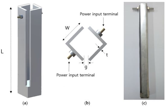 Structure of the heater rod: (a) side view (L = 500 mm); (b) top view (W = 2 mm, t = 0.1 mm, g = 0.3 mm); (c) photo of the heater.