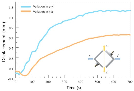 The structure of the heater rod was designed as shown in Figure 3 to withstand temperature rise in a short time. The rectangular structure of the heater controls the direction of the expansion pressure. To verify the direction of expansion pressure induced by the structure, a light-emitting diode (LED) sensor was used to measure the value of displacement according to the direction of a stainless steel tube, which was used instead of a drilled hole in natural rock in an early laboratory expansion test []. In Figure 4, the maximum displacement of the stainless steel tube was 1.22 mm in the y-y’ direction and 0.75 mm in the x’ direction.