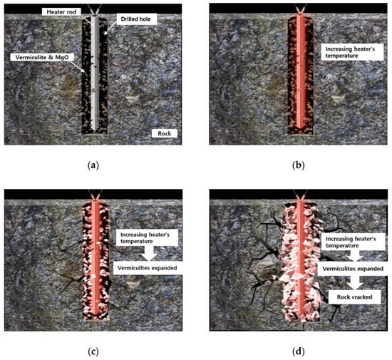 Figure 5 illustrates the process of the expansion-induced fracturing method. The first step is the setting up of a heater rod and expansion materials in a drilled hole of rock, as shown in Figure 5a. Once vermiculite flakes and MgO powers are evenly mixed and inserted into the hole along with the heater rod, the heating system is connected to the heater rod for operation. In the second and third steps, the temperature of the heater is raised (Figure 5b), and the vermiculite flakes are expanded (Figure 5c). The temperature of the heater is set to the maximum of 950 °C; this temperature is generally attained within 3 min after system operation. Figure 5d illustrates the final step in which the rock cracks because of the expansion pressure of the vermiculites. This whole process of the vibration-free excavation is completed within 30 min.
