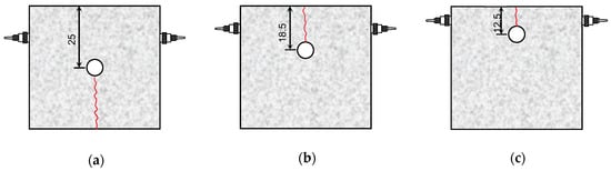 Schematic drawings of three rock specimens configured with transducers at hole-to-face distances of: (a) 25 cm; (b) 18.5 cm; (c) 12.5 cm. The numbers are in centimeter units.