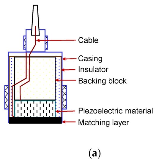 A pair of disk-shaped piezoelectric transducers was used to monitor the crack propagation in a rock specimen. A pulse-transmission method using the two piezoelectric transducers was employed to directly estimate the dynamic properties of a material placed between the two transducers. Figure 7a shows the structure of the piezoelectric transducers (Ultran, SWC75-0.05, Boalsburg, PA, USA), which consist of a piezoelectric element, backing block, matching layer, and casing. When a voltage is applied, the piezoelectric elements generate mechanical vibration. Conversely, the piezoelectric elements generate electric energy when they are deformed by external mechanical excitation. The backing block is effective for controlling the extent of ringing, and the impedance of the backing block should match that of the piezoelectric element to minimize internal reflections in the transducer. The matching layer can be installed in front of the piezoelectric element to protect the piezoelectric element and to match the impedance between the tested material and piezoelectric element. An encapsulation noise control material was installed between the casing and piezoelectric element to minimize the external noise, and furthermore, the electrical noise was reduced by grounding the casing. The disk-shaped piezoelectric transducers had an outer diameter of 25 mm, and the active element diameter was 19 mm. Considering that the Huygen’s wavelets radiated from all points on the surface of transducers propagate through the material, the amplitude fluctuates in the near field of the transducer []. The nominal frequency of the transducer used in this study was 50 kHz.