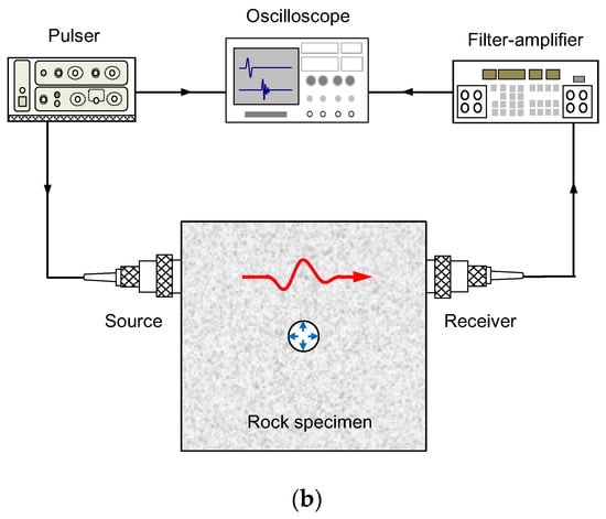 Macroscopic brittle failure of rock induced by stress and thermal conditions can be observed easily by the naked eye. However, before brittle failure, microcracking can be detected by several methods such as a reflection technique based on acoustic emission, volumetric strain measurements, and elastic wave velocity monitoring []. Elastic wave-based testing methods are widely used to investigate the elastic wave characteristics of various geomaterials [,,,,,]. It is well known that the elastic wave velocities in a solid will be reduced by the presence of cracks [,]. Byun et al. proposed a new method to predict the crack density in porous-cracked rocks using the elastic wave velocities []. However, few attempts have been made to better characterize crack propagation in large rock specimens based on the elastic wave characteristics under the mechanical expansion of brittle rock.