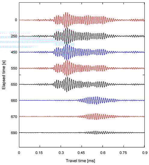 The elapsed time after heating the system was recorded from 0 to 30 min, and the output signals were obtained from the elastic wave measurement system every 10 s. The typical waveforms obtained for a rock specimen with the elapsed time are plotted in Figure 8. Considering the radius of the transducer and the wavelength, the length of the rock specimen was significantly greater than the length of the near field. In the initial stage, the waveforms rarely changed with the elapsed time, and accordingly, the first arrival time and maximum amplitude of the waveforms obtained at initial times remained almost constant. As the crack propagated, the first arrival time increased rapidly, and the maximum amplitude gradually decreased as more time elapsed.